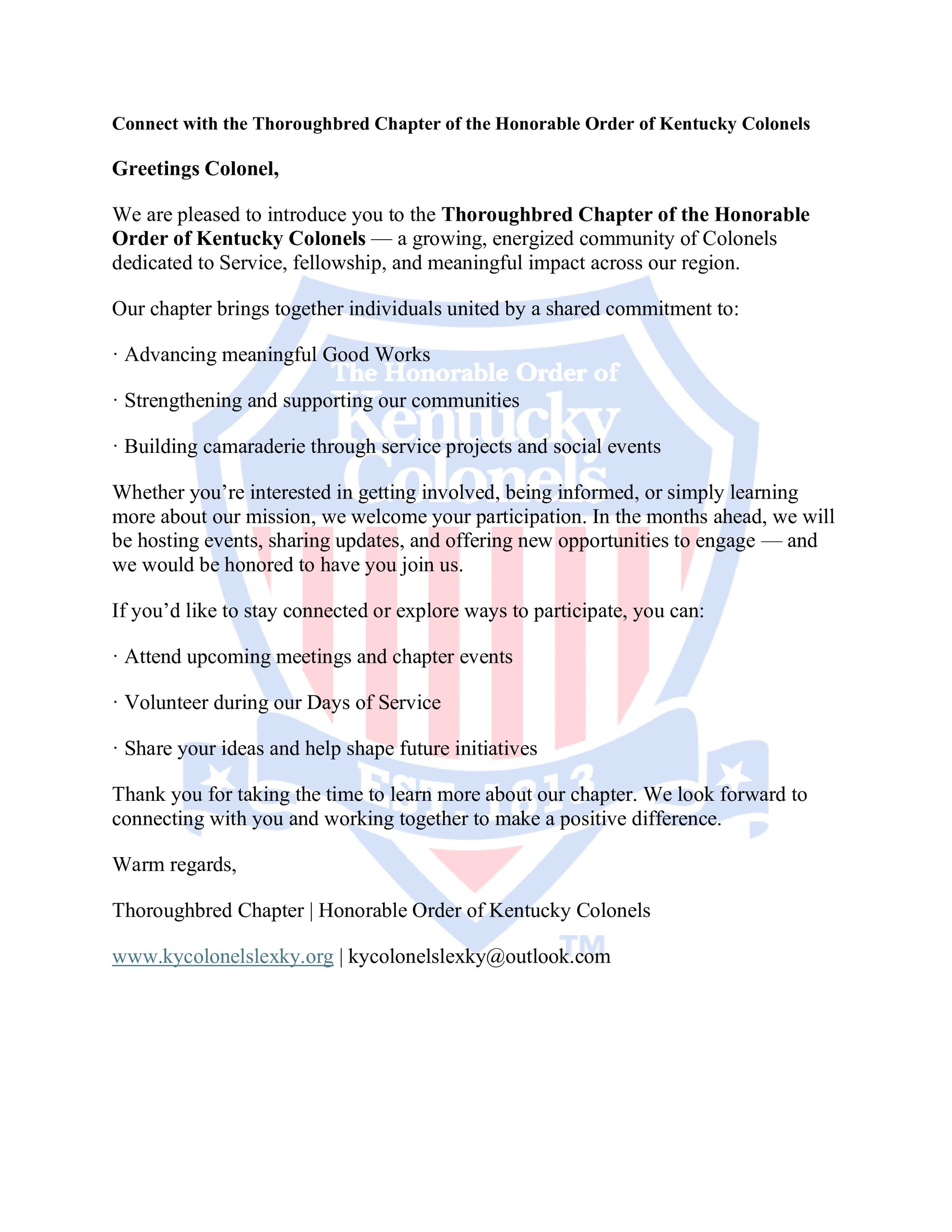 The Thoroughbred Chapter of the Honorable Order of Kentucky Colonels was officially chartered on May 6, 2024. Founded by dedicated Colonels with a shared vision for service, the chapter was created to strengthen the impact of the HOKC Good Works Program and to bring together commissioned Colonels who value fellowship, community engagement, and meaningful contribution.